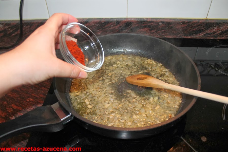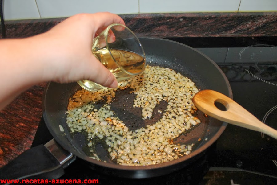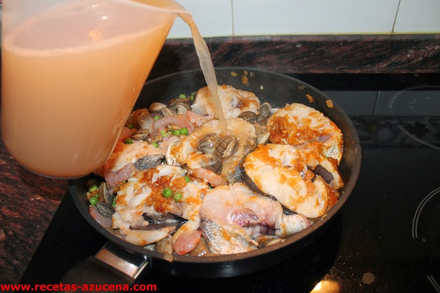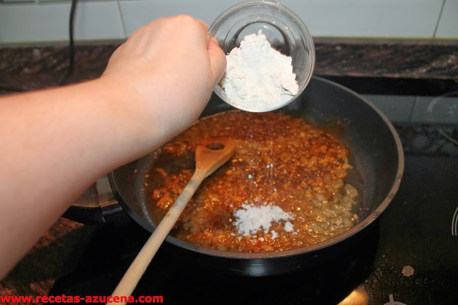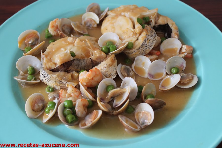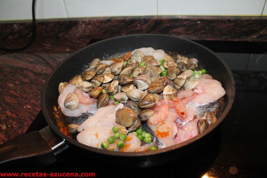 Cuando la cebolla empiece a dorar añadimos el vino blanco, lo dejamos reducir unos minutos, seguidamente pondremos el pimentón y la harina, sofreímos unos segundos para continuar añadiendo las rodajas de merluza, las gambas, las almejas y los guisantes, esperamos un poco y le damos la vuelta con cuidado a las rodajas de merluza.
