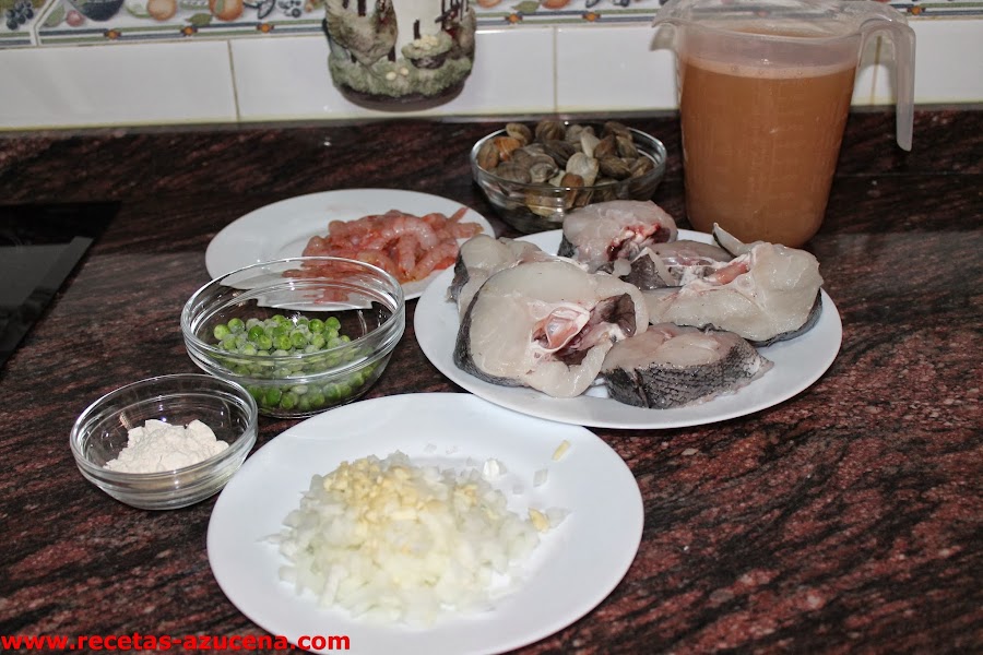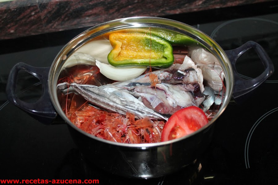 En una olla ponemos las cascaras de las gambas, la cabeza de la merluza, el tomate, el pimiento, el agua, la cebolla y un poco de sal, pondremos la olla al fuego y la dejaremos hasta que hierva y suelte todos los jugos, una vez hecho lo colamos y reservamos.