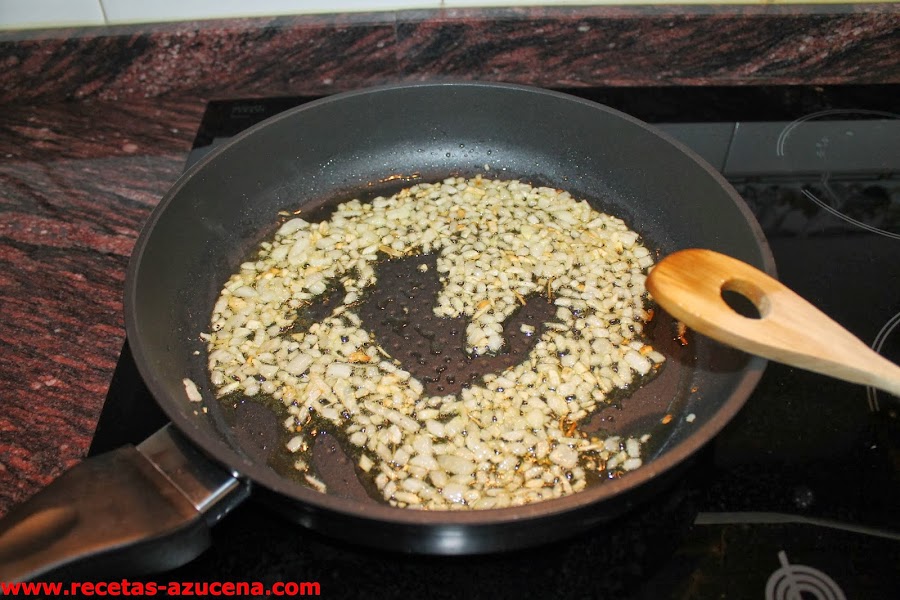 Ahora empezamos con el plato, ponemos una sartén amplia al fuego a fuego medio, cuando este caliente añadimos un fondo de aceite, la cebolla, el ajo y salpimentamos.
