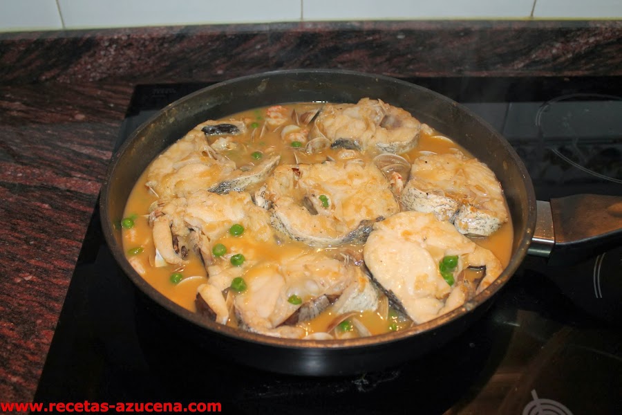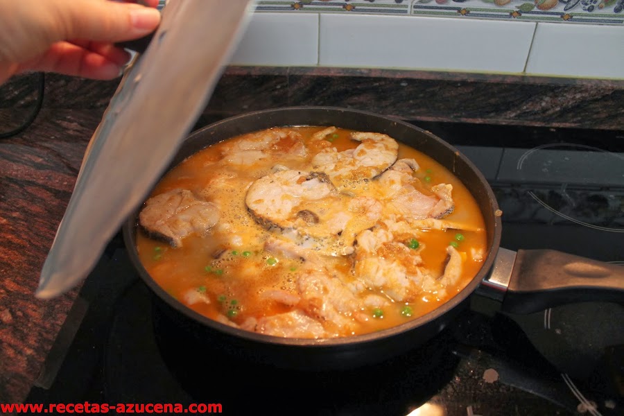Ahora taparemos la sartén y dejaremos cocer el suficiente tiempo para que el pescado se haga y espese un poco la salsa, este tiempo depende del tamaño de la rodaja de pescado.