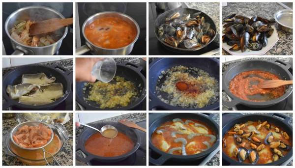 Y vertemos 3 – 4 cacillos del caldo anterior además de la mitad del caldo de abrir los mejillones y dejamos cocer 10 minutos.