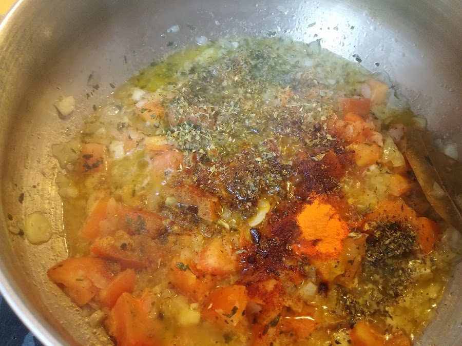 Dejamos freír unos minutos y echamos una cucharadita de cada especia y una cucharada de orégano y otra de vinagre. Dejamos unos 7 u 8 minutos.