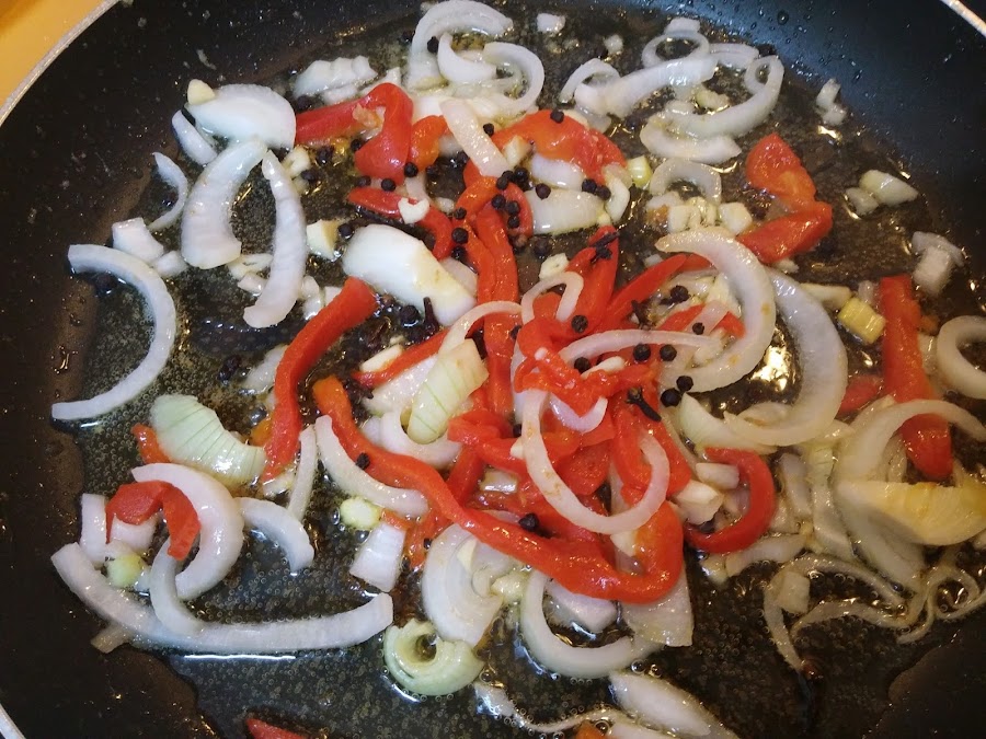 Dejamos hasta que la cebolla y el pimiento estén hechos.