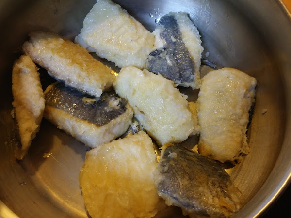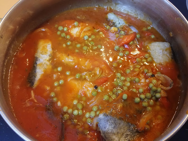 Vamos a dejar cocer unos 20 minutos. Si ya está el pescado listo pero la salsa ha quedado líquida, podéis espesarla con harina de maíz, como hice yo, ya que la salsa debe quedar espesita, perfecta para mojar pan ;-)