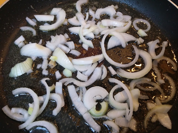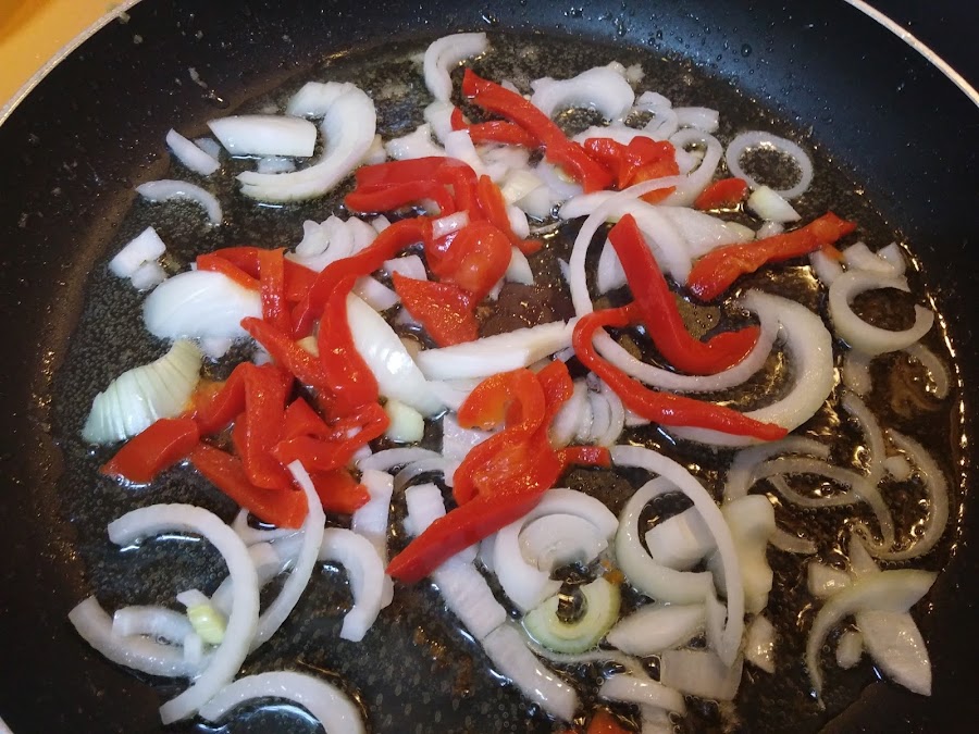 Cortamos la cebolla y el pimiento en juliana y los vamos a pochar en la misma sartén.