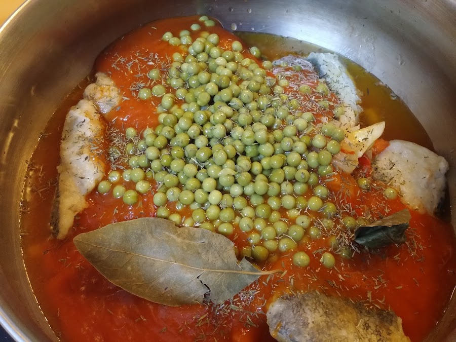 Vertemos por encima el sofrito de cebolla y pimiento. Y todo lo demás: la latita de guisantes, la salsa de tomate, un chorreón de vino blanco, tomillo al gusto y una o dos hojas de laurel. Añadimos también un poco de agua y rectificamos de sal.