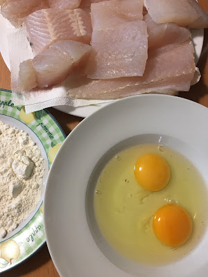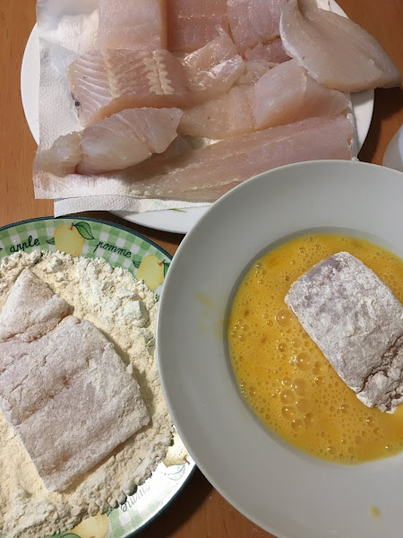 Se sala ligeramente el pescado, se pasa por harina, sin que se embadurne en exceso (se pude agitar un poco cada lomo de merluza para que suelte la harina sobrante) y se sumerge en el huevo batido.