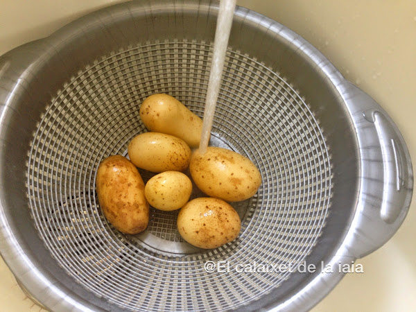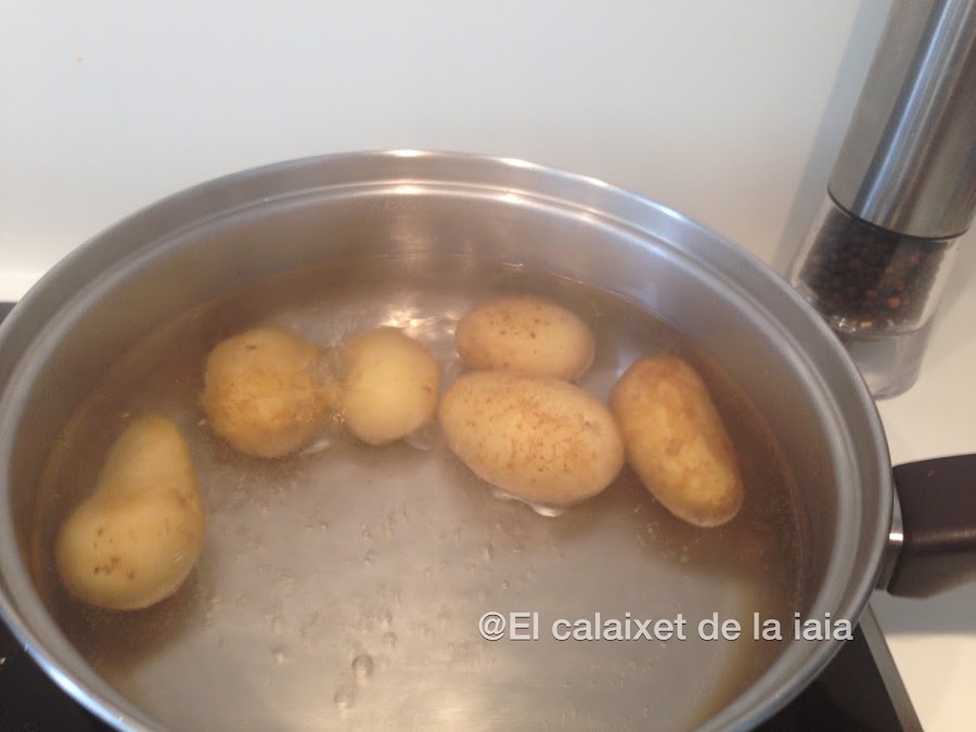 y las ponemos a cocer con agua hirviendo y sal, cuando podamos pincharlas estarán listas, las escurrimos, dejamos templar, las pelamos y reservamos