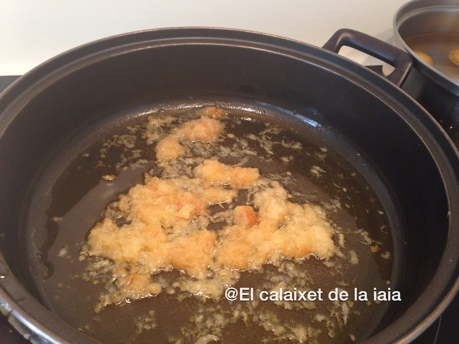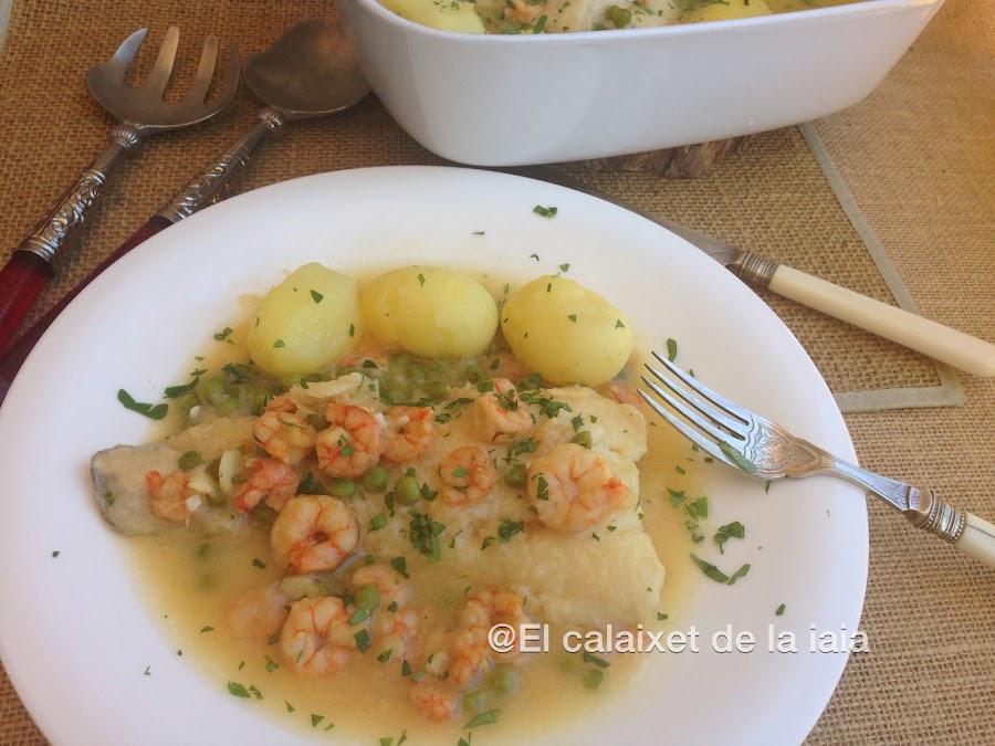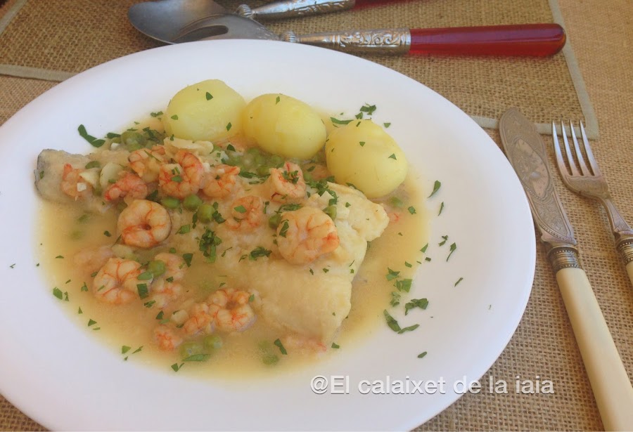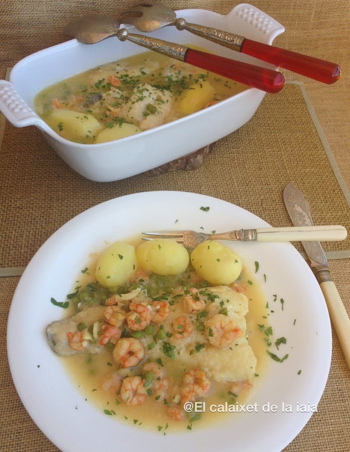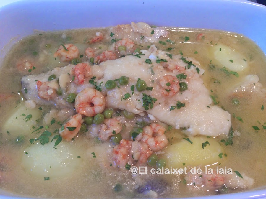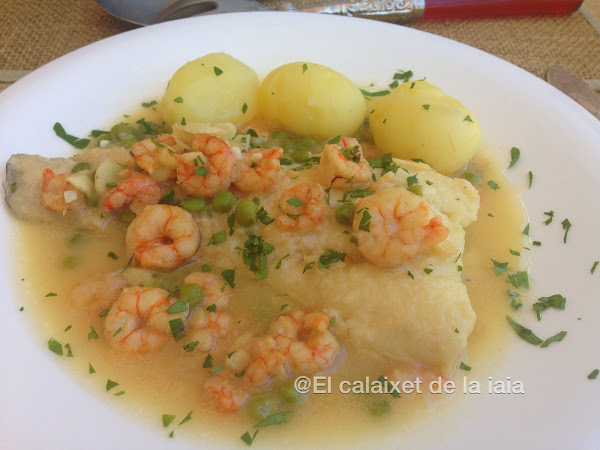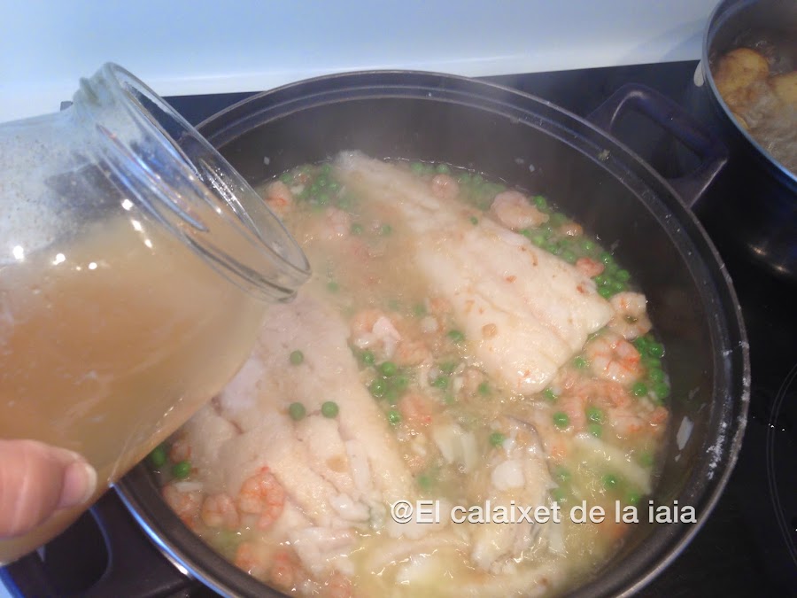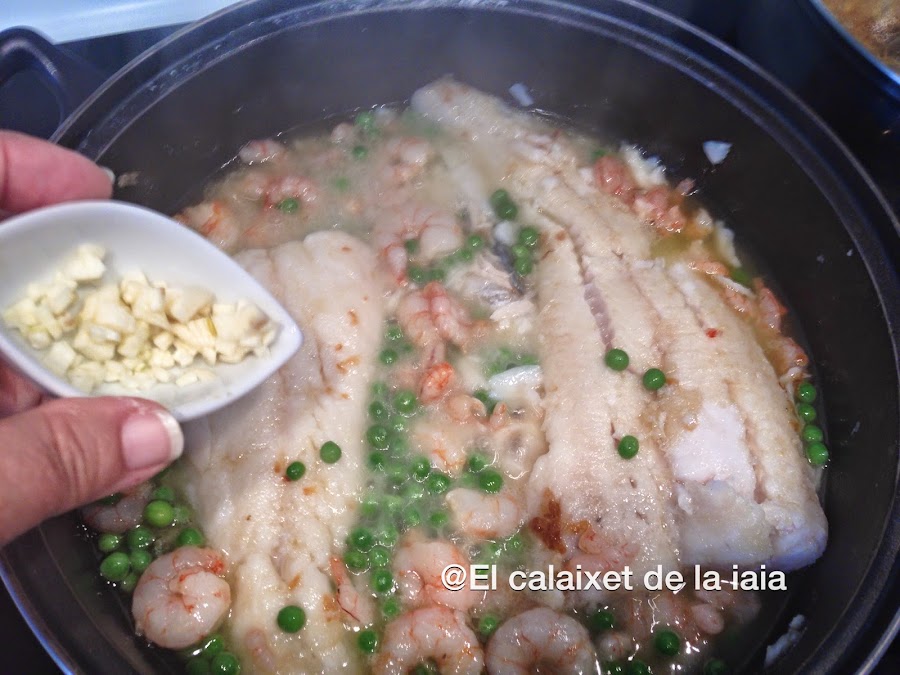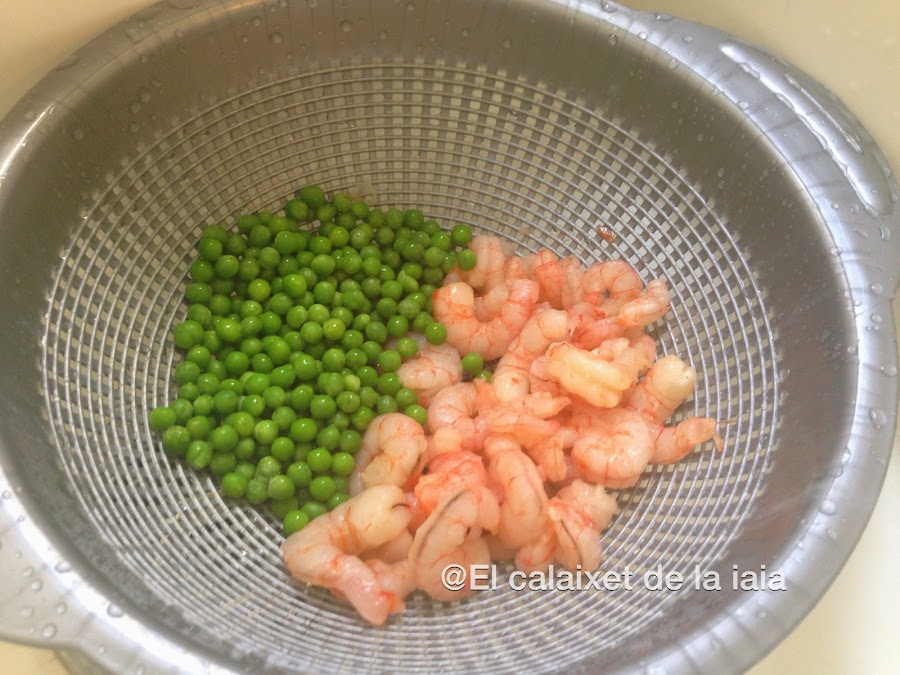Las gambitas y los guisantes no están en la foto de ingredientes porque estaban escurriéndose y se me ha pasado.