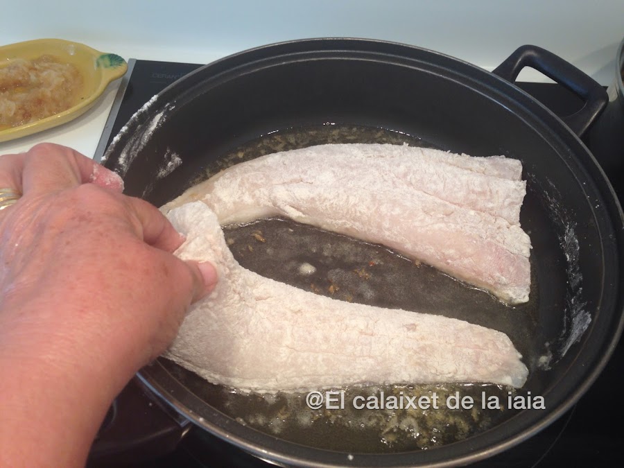enharinamos los filetes de merluza y los ponemos a freir en aceite de oliva, una vez dorados reservamos