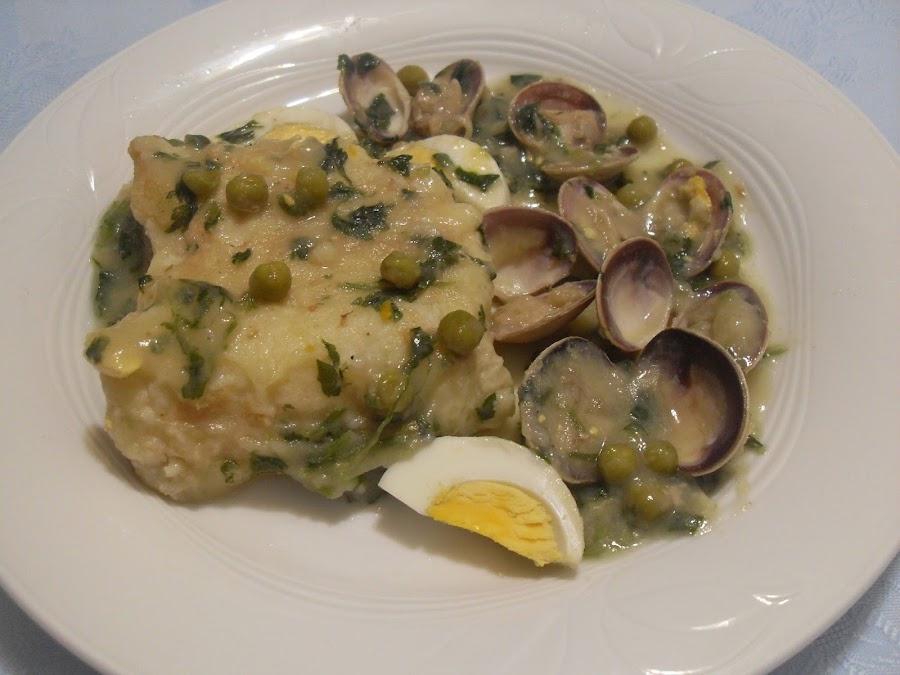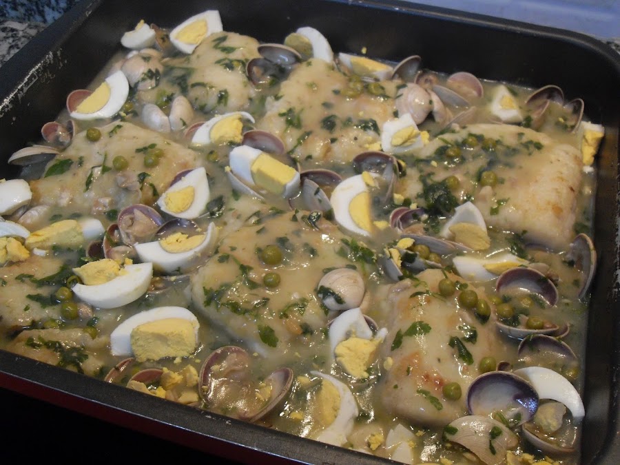 Disponer los lomos de merluza encima del sofrito de cebolla, seguir moviendo en vaivén la cazuela para que no se pegue y la salsa se vaya ligando. Dar la vuelta a los lomos de merluza, con cuidado. Espolvorear el perejil picado, remover en vaivén la cazuela, dejar cinco minutos más de cocción, añadir las almejas con su caldito y poner los trozos de huevo cocidos y los guisantes, remover y retirar del fuego.
