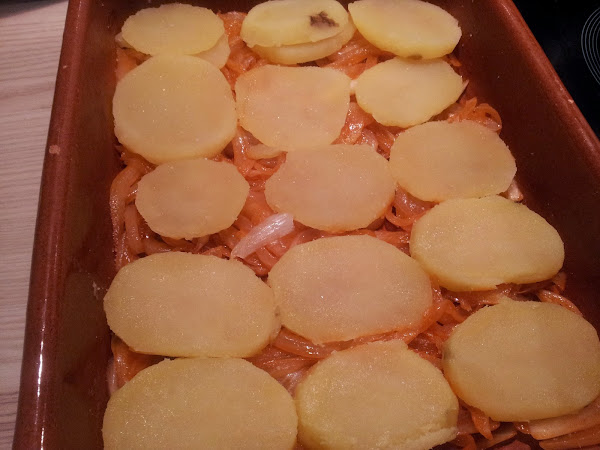 Colocamos las rodajas de las patatas sobre la cama de cebolla. Salamos ligeramente.