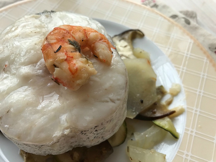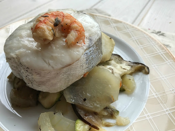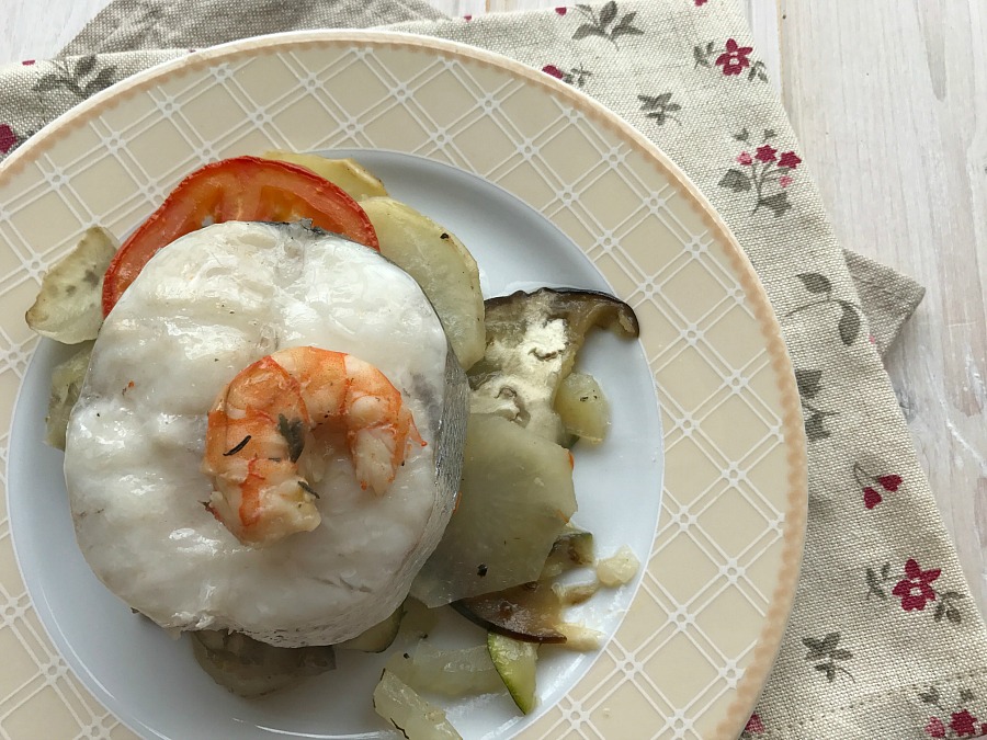 Merluza al horno con langostinos y tian de verduras