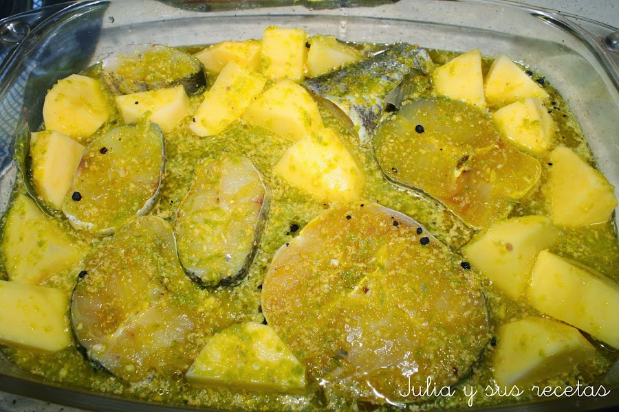 En una fuente de horno ponemos un chorreón de aceite de oliva. Ponemos la merluza encima y las patatas. Le añadimos la pimienta en grano y el triturado anterior, se lo echamos por encima junto con 1/2 vaso de agua.