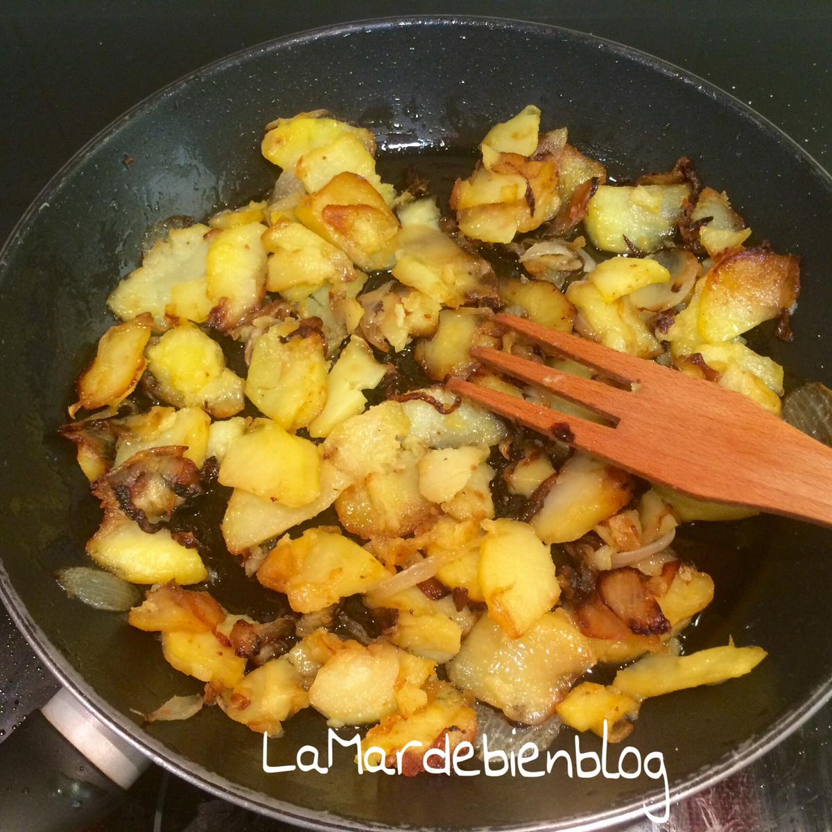 Dorar las patatas y cebolla con un poco de aceite lentamente hasta que estén blanditas
