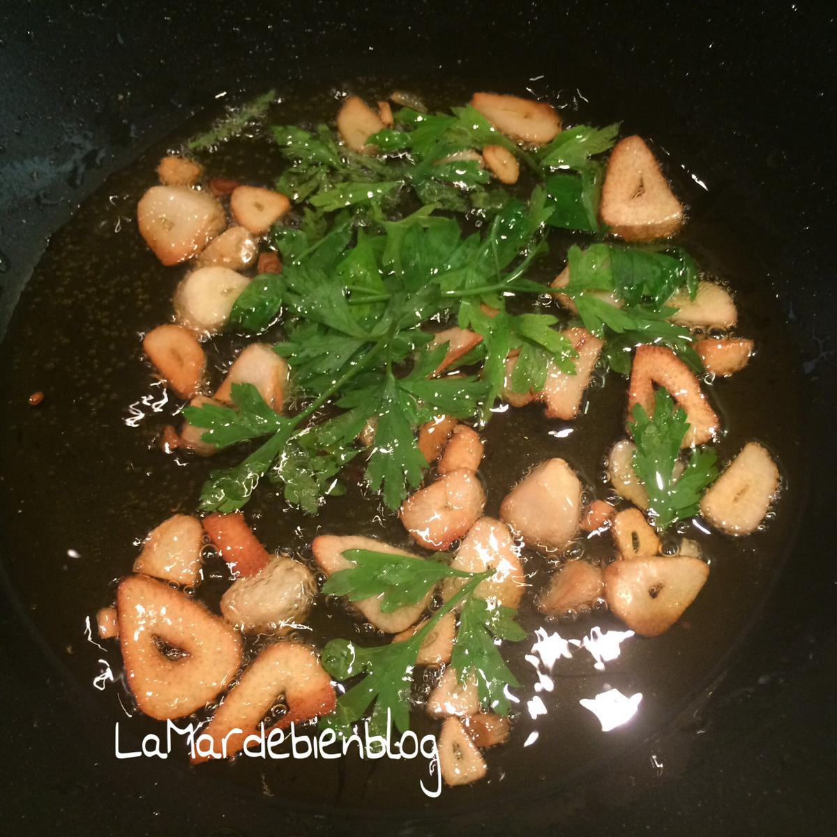 En otra sartén dorar ajos cortados en láminas y añadir el Peregil y vinagre.(dejar apartado hasta el final)