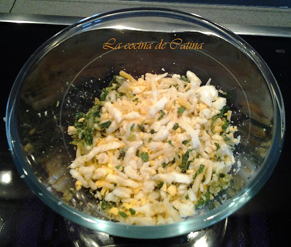 Lavar y picar el perejil y el ajo, y ponerlos en un bol junto con los huevos duros picados, el pan y el queso rallados.