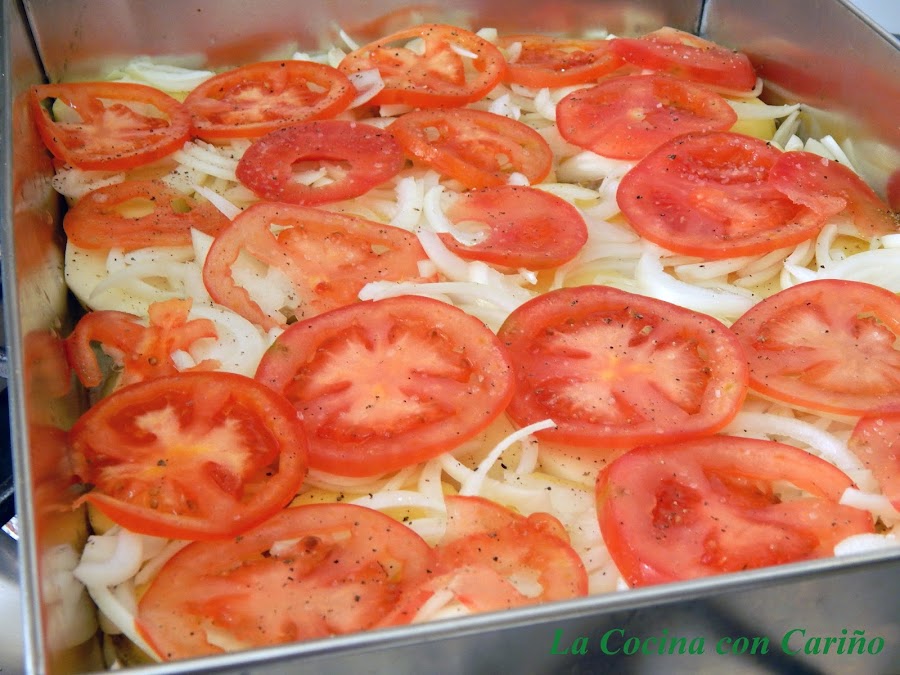 Sobre esta capa vamos a colocar la cebolla, que también salpimentaremos y sobre ellas los tomates. Rociaremos por encima con 4 copas de agua y 1 de vino blanco, y un poco de aceite de oliva. Meteremos en el horno y dejaremos unos 40 a 50 minutos, en función del tipo de patata.