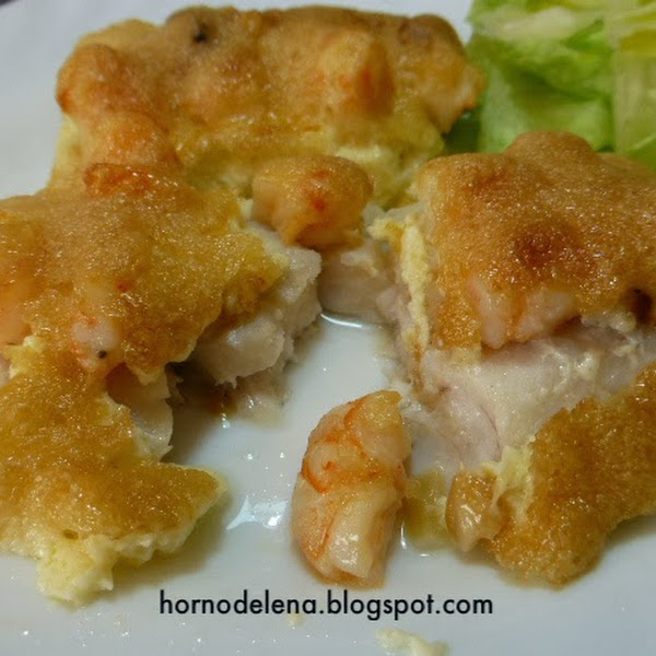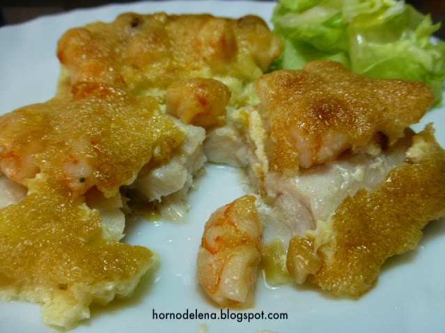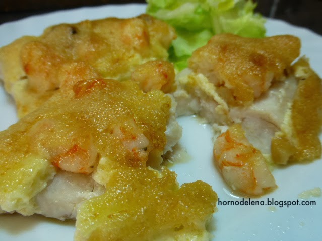 Ponemos los lomos de merluza en la fuente para el horno. Añadimos por encima de los lomos las gambas con los ajos, retirando la cayena.