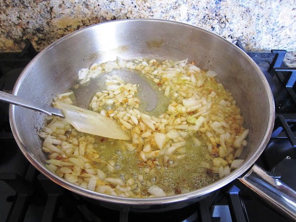 En el mismo aceite, sofreír los ajos y la cebolla. Cuando estén blandos, añadir el agua y remover unos minutos para que espese.