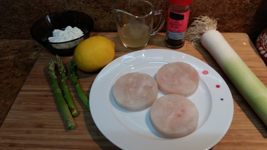 150 gr de merluza, 1 puerro, 3 espárragos trigueros, 5 cl de caldo de verduras, 2 cucharadas de yogur desnatado, limón, sal, pimienta, y hierbas frescas.