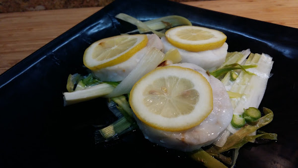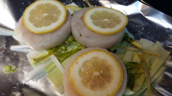 Las láminas de puerro y espárrago, la merluza salpimentada y una rodaja fina de limón por encima.