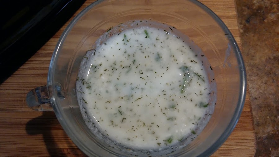 Mientras se cocina el papillote, pondremos 2 cucharadas de yogurt en un cuenquito, unas gotas de limón y una cucharada de caldo de verduras. Añadiremos una buena cucharada de hierbas frescas picadas, perejil, eneldo, cebollino....