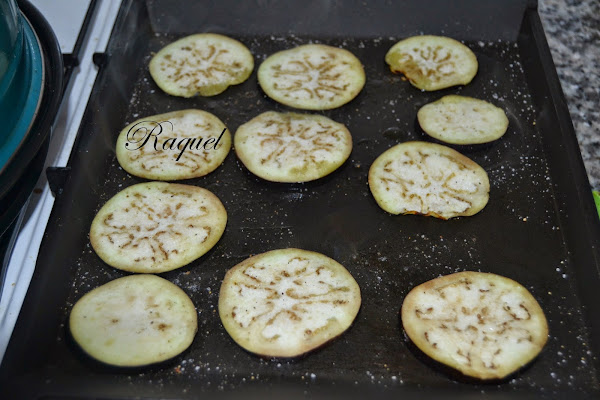 Cortamos la berenjena a rodajas y las ponemos unos diez minutos en un bol con agua y sal, la escurrimos bien y reservamos.