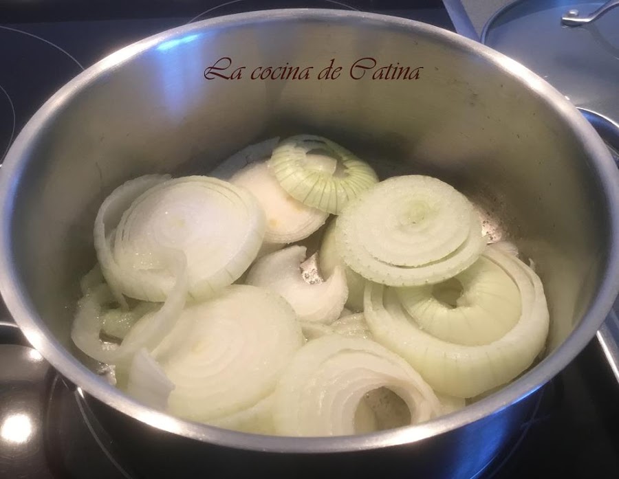 Ponemos la cebolla en una sartén con aceite, la salpimentamos y la dejamos cocer tapada a fuego lento durante 10 minutos.