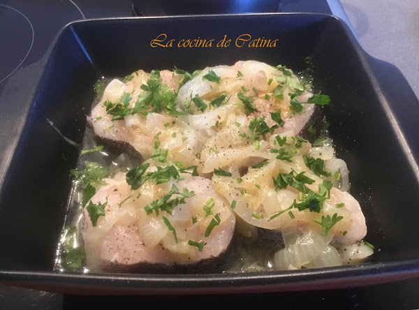 Colocamos la merluza sobre la cebolla, salpimentamos, ponemos por encima los aros de cebolla que hemos reservado, regamos con el vino blanco, espolvoreamos con el perejil picado y poner unos trocitos de mantequilla por encima.