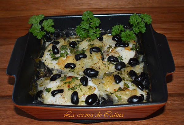 Horneamos durante 20 minutos. Sacamos la fuente del horno y repartimos las aceitunas negras por encima y volvemos a hornear durante otros 5-10 minutos.