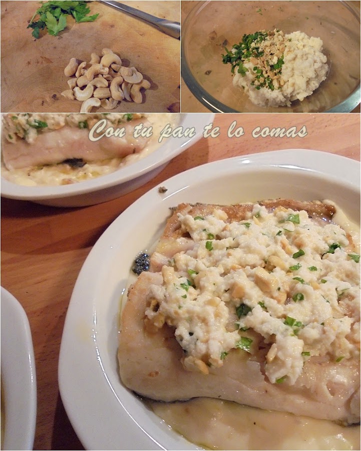4. Remoja las rebanadas de pan de molde en un poquito de leche, escúrrelo bien y desmenúzalo con los dedos. Pica los anacardos y el perejil y junta con el pan escurrido. Reparte este picadillo encima del pescado.