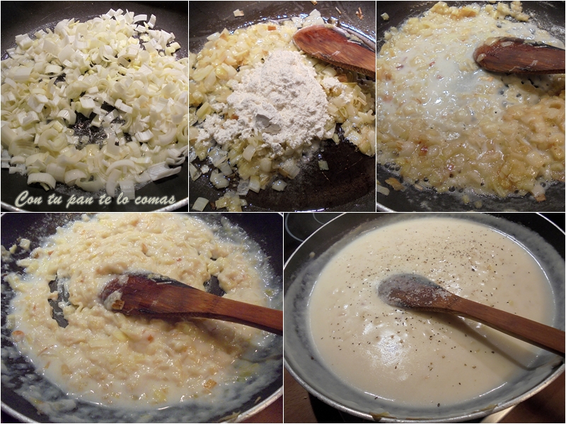 2. Añade la harina, tuéstala un poco y ve añadiendo la leche poco a poco según se vaya absorbiendo, sin dejar de remover. Sazona con sal y una pizca de pimienta negra. Esta bechamel la puedes poner en cazuelitas individuales o en una fuente de horno.