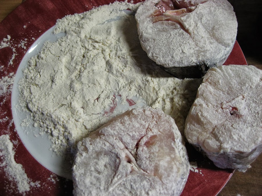 2º " Pasamos la merluza por harina, sacudimos el exceso y la freímos, 2 minutos por cada lado.