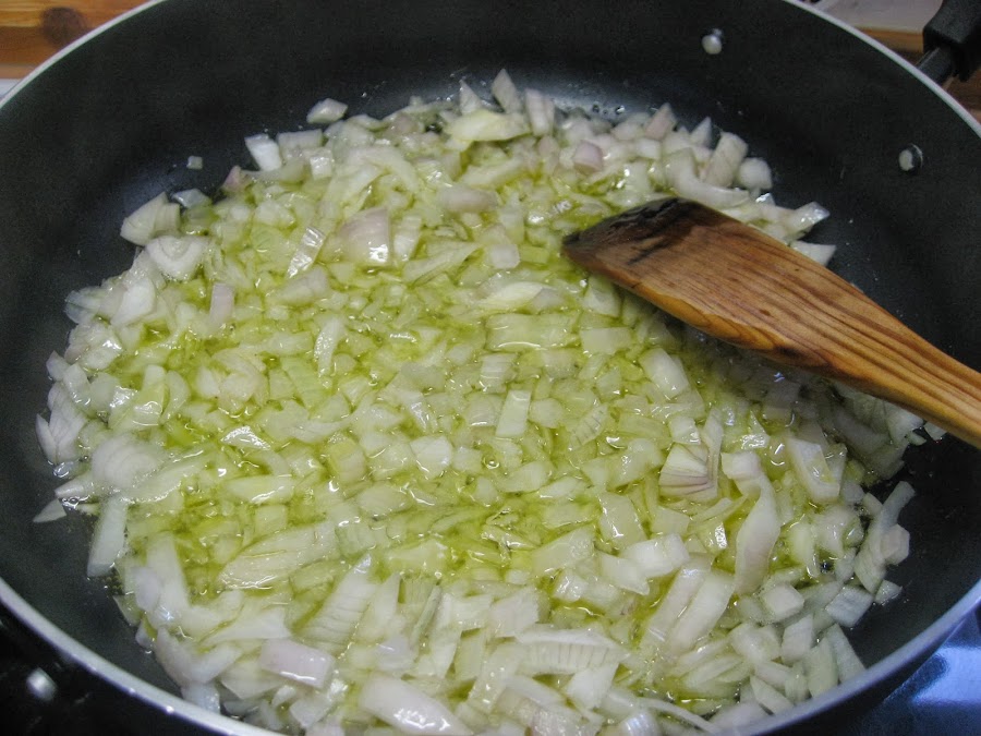 1º " Cortamos la cebolla a trozos pequeños y la ponemos a freír hasta que quede pochada.