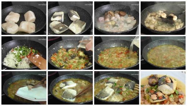 Añadimos ahora de nuevo las setas y las gambas; y la merluza que teníamos dorada y dejamos que se cocine el conjunto 5 minutos, el tiempo justo para que se termine la merluza.