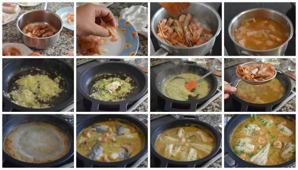 Pelamos los gambones; por un lado reservamos la carne; y la cabeza y la piel las ponemos al fuego con un chorrito de aceite de oliva.Dejamos a fuego vivo hasta que cambien de color y haciendo presión para que suelten todo su jugo, cuando estén anaranjadas vertemos el caldo de pescado en la cazuela y dejamos que de un hervor; reservamos.