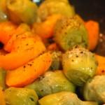 Para la guarnición rehogamos unas alcachofas de pequeño calibre con 2 melocotones cortados en gajos en un par de cucharadas de aceite. salpimentamos someramente y espolvoreamos con perejil.