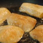 Ponemos los lomos de merluza, limpios y salpimentados, en un adobo de salsa soja, un chorro de aceite de sésamo y raíz de jengibre muy picadita. Los dejamos macerar al menos 4 horas.