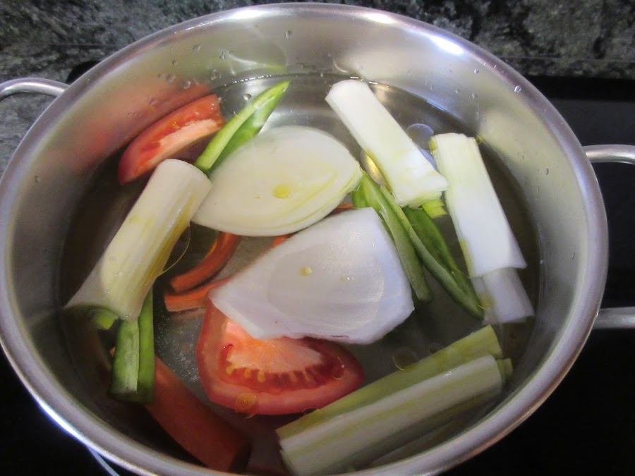 Ponemos agua en una olla y ponemos las verduras con un chorreón de aceite y sal, dejamos cocer 15 minutos, a fuego medio.