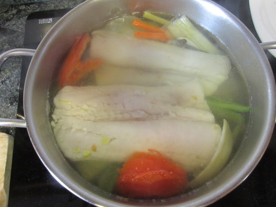 Pasado el tiempo ponemos el pescado, dejamos cocer 5 minutos, apagamos el fuego y dejamos el pescado enfriar en el caldo.