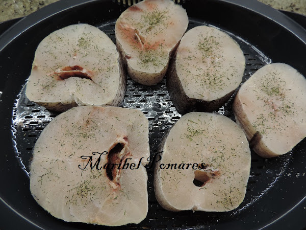 Mientras preparamos la merluza, untamos la bandeja del varoma con aceite de oliva, colocamos la merluza.