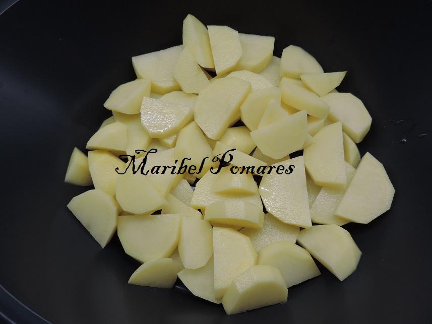 Pelamos y lavamos bien las patatas, las cortamos en trozos no muy gruesos, las ponemos en el recipiente del varoma.