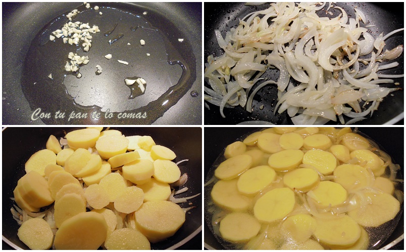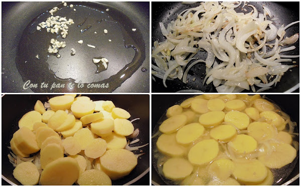 4. Pelamos y cortamos las patatas en ruedas de un dedo de grosor (si las pones más finas se romperán) y las añadimos a la cazuela cuando la cebolla esté pochada.