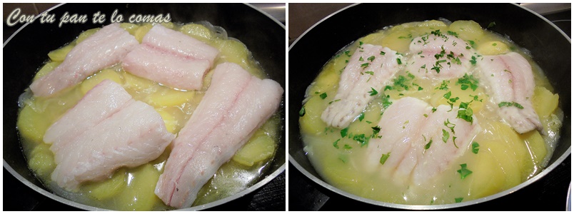 6. Cuando veas que las patatas están casi hechas incorpora la merluza, sazona con sal los trozos y tapa de nuevo la cazuela para que se haga más rápido. No es necesario darles la vuelta, mejor mueve la cazuela con movimientos de vaivén, adelante y atrás y en 10 minutos con la tapa puesta, la merluza estará hecha. Para terminar añadimos un puñadito de perejil fresco picado.