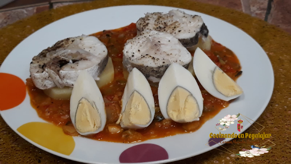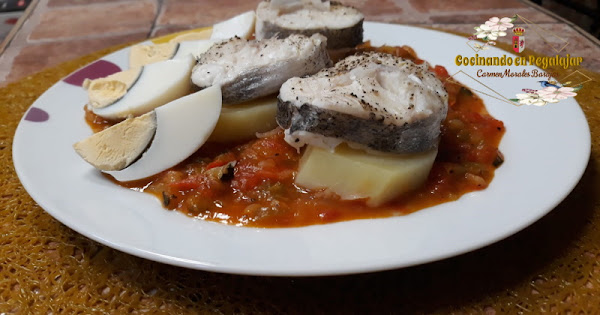Monta el plato en una bandeja o fuente de servir, coloca el pisto, encima las patatas, ponemos encima de las patatas la merluza, y decorar con el Huevo Cocido.