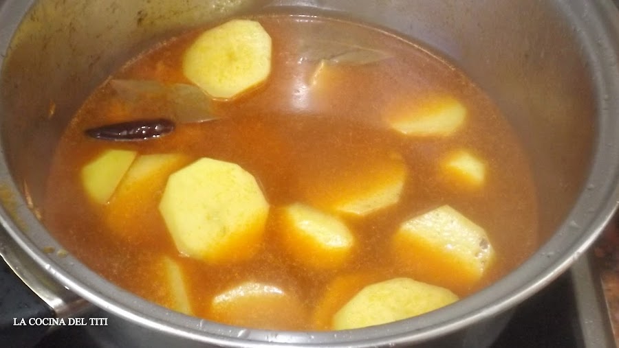2º Echamos las patatas y rehogamos ligeramente para que mezcle todo correctamente. Añadimos el caldo de pescado que habremos hecho con la cabeza y las espinas, echamos su sal y dejaremos que hierva hasta ponerse tiernas las patatas (15 minutos aprox. segun la patata).