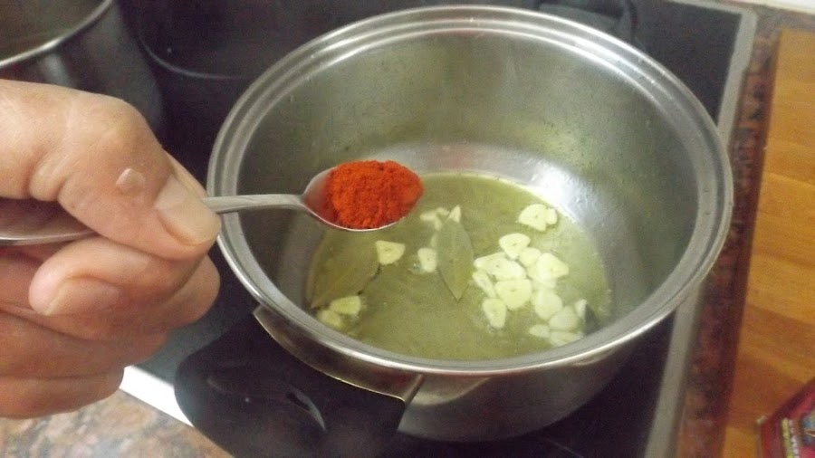 1º Pondremos aceite de oliva a calentar y doramos los ajos, junto a la cayena y laurel, añadimos el pimenton dulce y picante con cuidado de que no se nos queme para que no amargue.