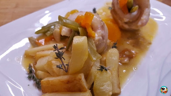 Merluza con salsa de naranja, rellena de verduras y una papas fritas. Una receta que se hace en un pispás. Un plato muy aromático, suave y ligero.
