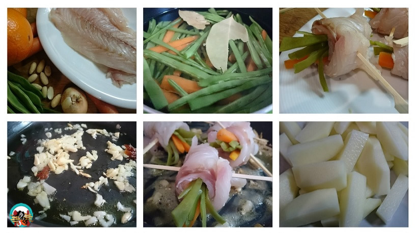 3.- En una sartén ponemos un poco de aceite de oliva a calentar. Pelamos los ajos y los cortamos en laminas. Pelamos la cebolla y la cortamos en dados pequeños. Cortamos las almendras en tiras alargadas. Sofreímos todo unos minutos en la sartén sin que llegue a quemarse. *Añadimos las tiras naranja confitada, incorporamos una cucharada de harina y la removemos bien. Vertemos el zumo de una naranja y un poco de caldo de verduras, removemos bien hasta hacer una salsa. Incorporamos los filetes enrollados y los cocinamos 4 minutos por ambos lados. Si es necesario, añade un poco más de caldo de las verduras.